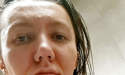 Beautiful tanned topless girl with big tits gets yam-sized spunk on her beautiful face and mouth in the shower